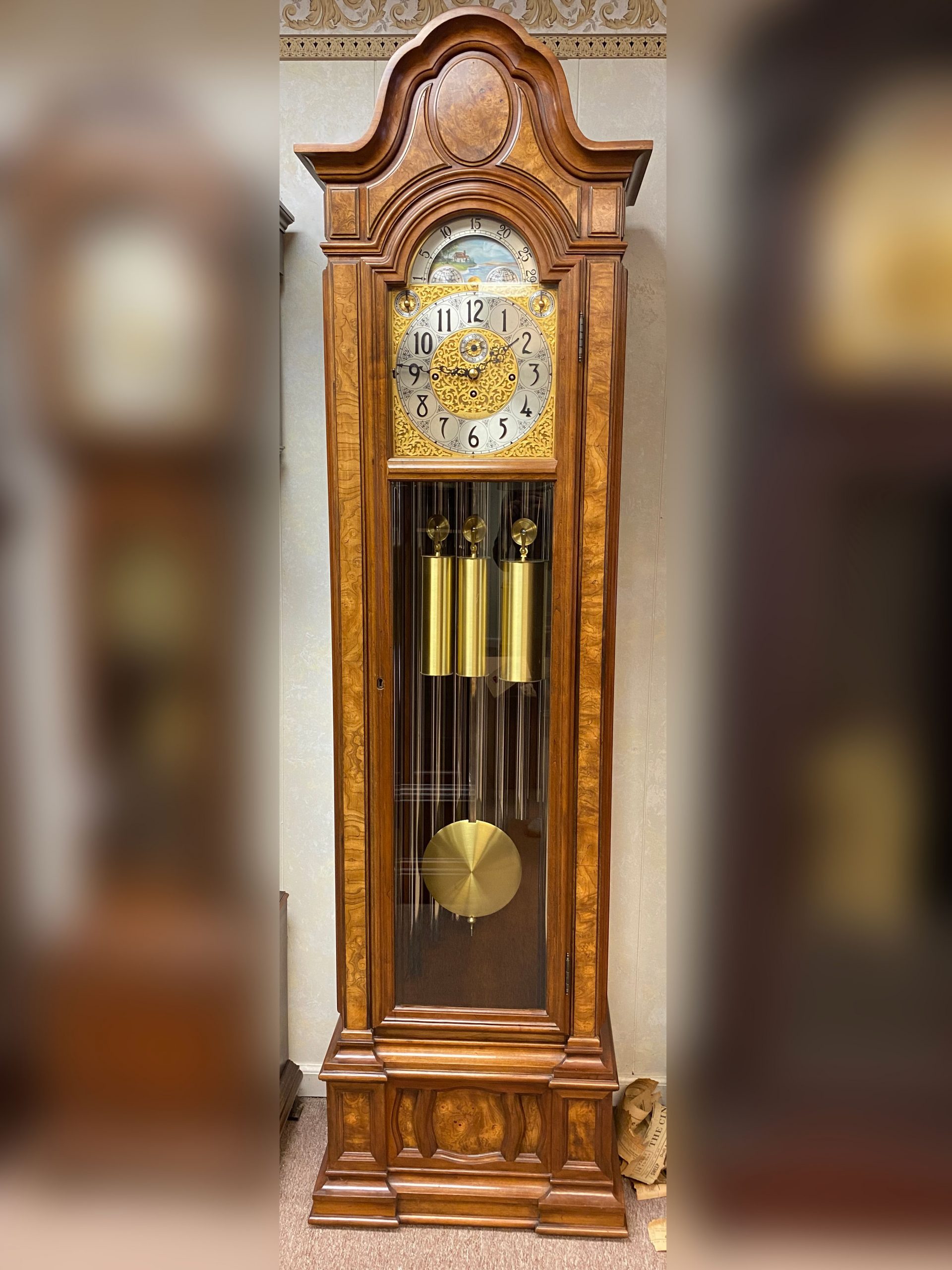 Triple-chime tubular bell movement and a beautiful light cherry cabinet burled veneer accents. It has beveled glass on the front and sides, and the clock is all completely original. This clock has been mechanically restored